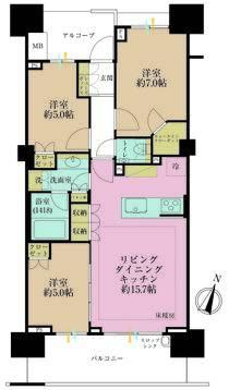 3LDK、専有面積70.27m2、バルコニー面積12.5m2