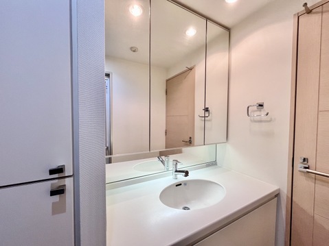 三面鏡洗面化粧のミラーを手前に引けば、楽な姿勢で髭剃りやメイクができます。合わせ鏡にすればヘアスタイルのチェックもラクラク。洗面化粧台のミラー裏にはたっぷり入る収納スペースを設けていま