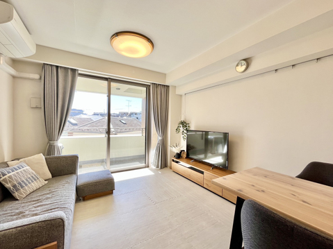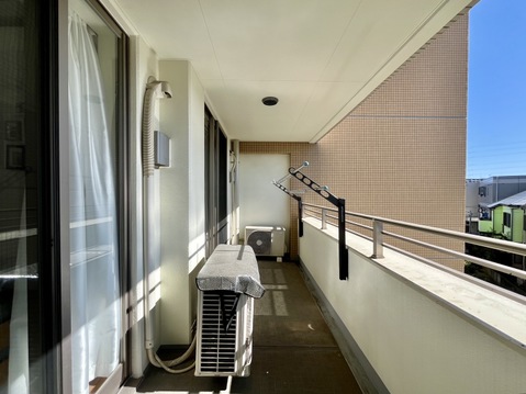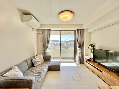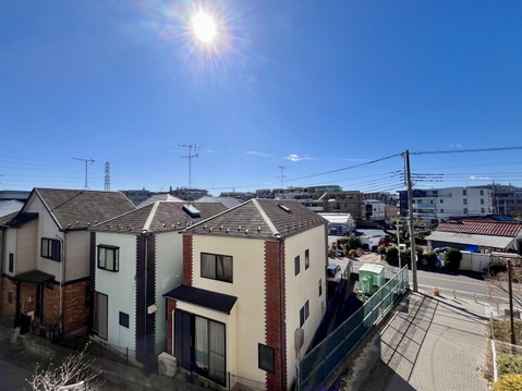 目の前は低層住宅街となっているため、周辺には高い建物がなく青い空が遠くまで広がります。2.2mのハイサッシュが採用されているため開放感があり、よりお部屋が広く感じられますね。